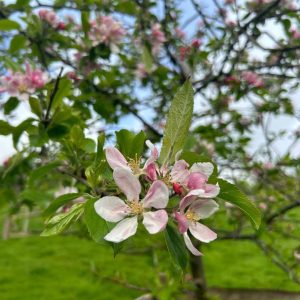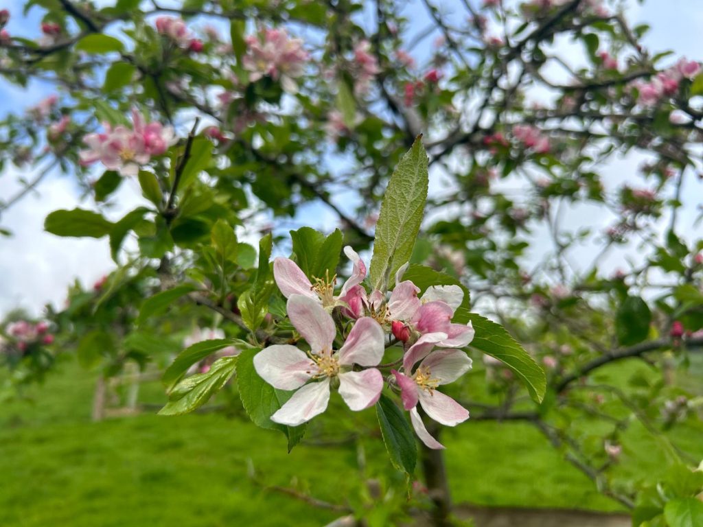 The orchard growing today at Lower Sharpham Barton Farm is a restoration of a historic orchard that once grew in the late 1800s. This traditional orchard was funded to be re-established in 2015 as part of a higher-level stewardship ecological restoration project at the farm. A trainee helped to research suitable species and the project was underway. Using a historic map from the 1880s for reference and recommendations from natural England, this lost hectare of blossoming fruit trees was born again. Since then, in 2019 another budding trainee at Ambios began a project to record and identify the trees. This has provided great insight to use today with information regarding the trees locations, species name and species use.